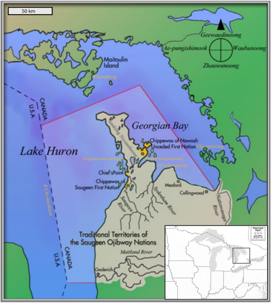 The Ontario appeal court again denied the larger Aboriginal Title to the waters around the peninsula, as far as the U.S. border in Lake Huron; but in an unusual move the court has invited SON to seek title to a smaller area. That would most likely be an area known to the Saugeen Ojibway in the Anishinaabe language as Nochemowenaing, translated to English as ‘Place of Healing.’ That location is on the Georgian Bay side of the peninsula in the Hope Bay area.
